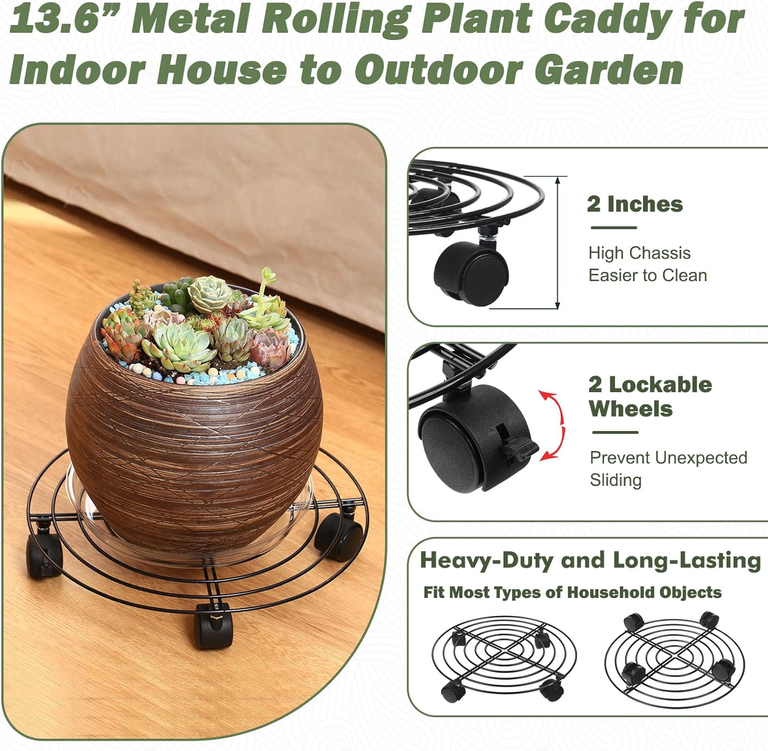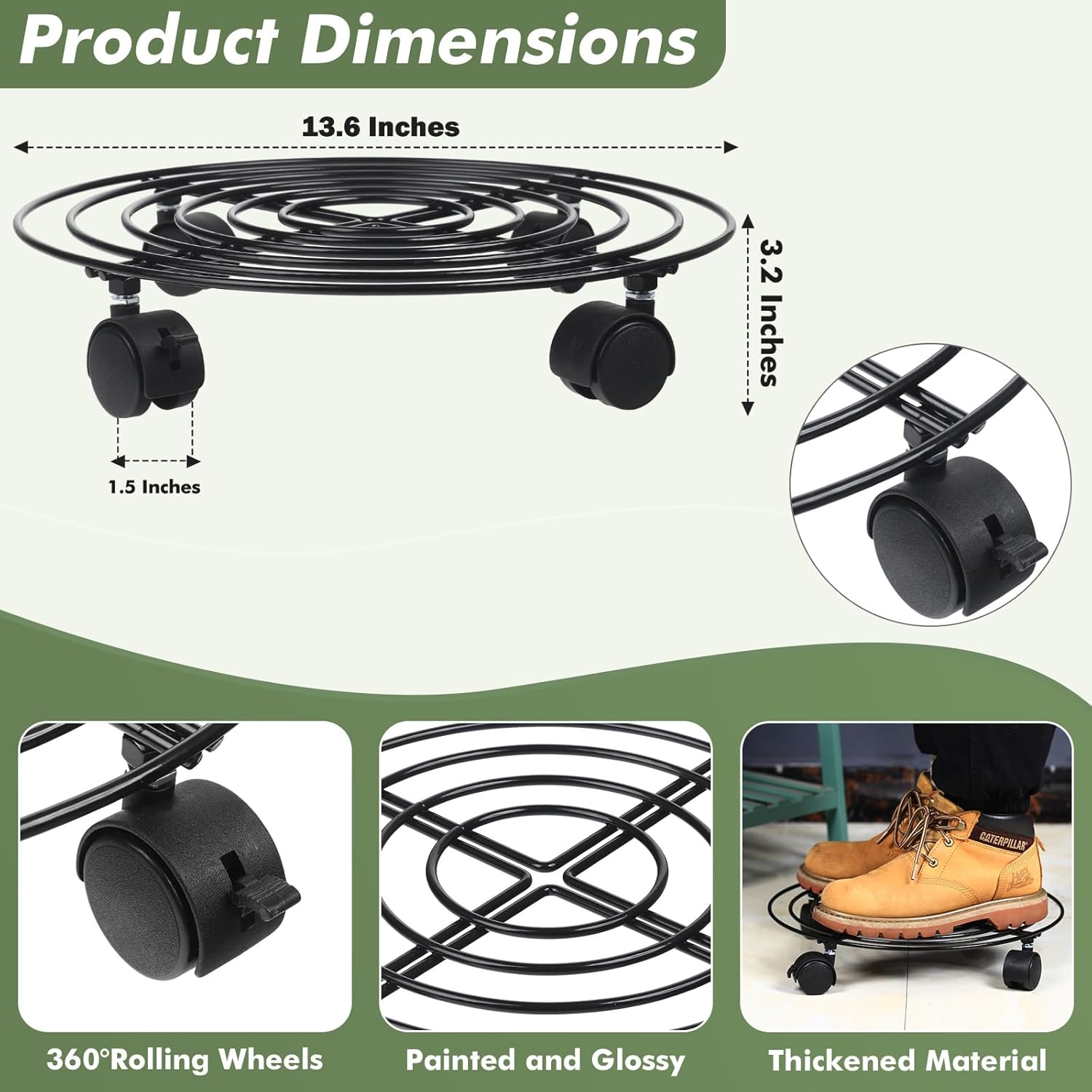 • Metal Construction & Strong Load Bearing: Each plant caddy is well painted and anti-rust. The plant stands with wheels are made from heavy-duty iron materials and strong enough to load up to 110 lbs. You can roll large, heavy plant pots around the rooms and the outdoors for easy watering. Easily to roll out into the sunlight and back to protected space!