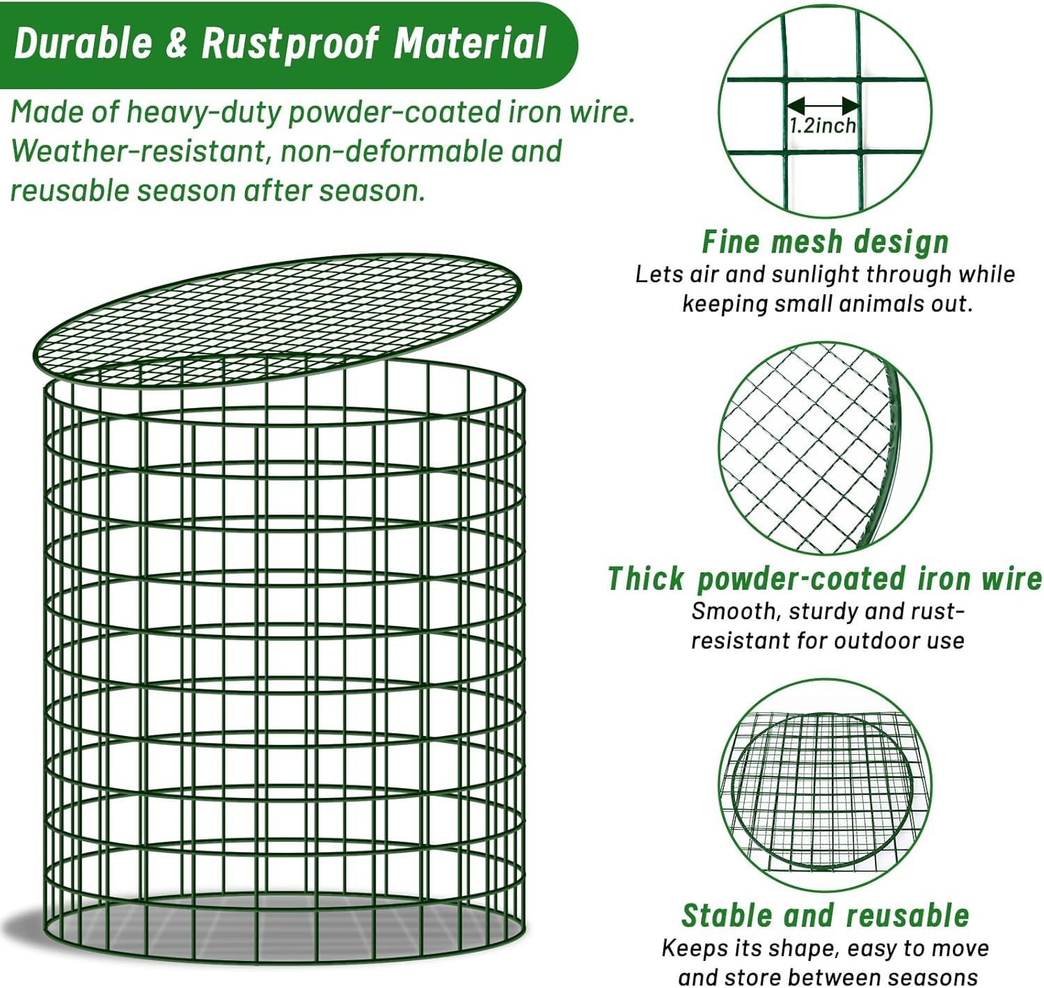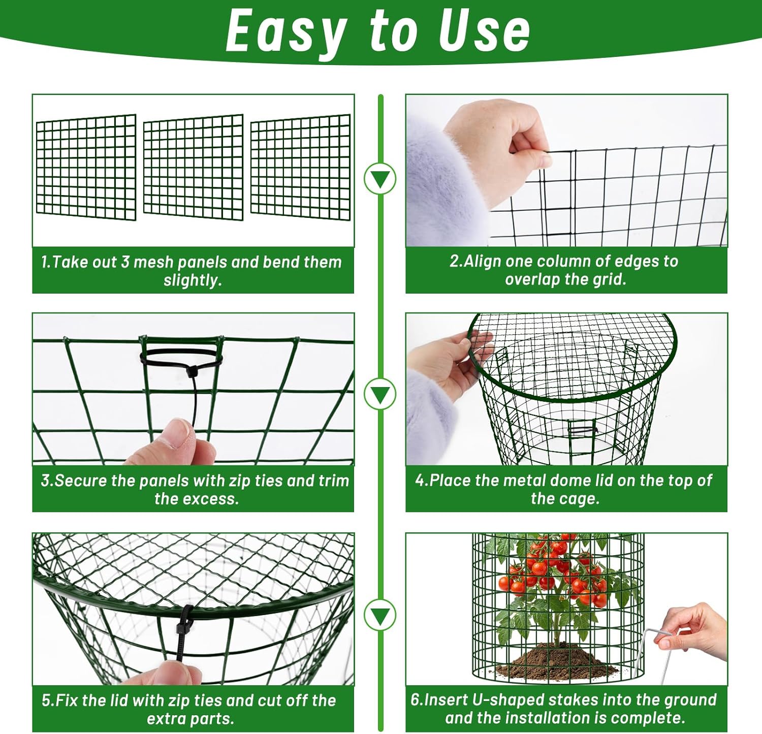 - 【Easy Assembly, Secure Stakes & Space-Saving Storage】 No tools required – simply bend the pre-cut panels, align the edges and fix them with the included nylon zip ties, then place the wire plant protector around your plant, attach the dome lid and secure it with U-shaped ground stakes. The plant cages for outdoor plants are lightweight yet stable, easy to move for pruning and harvesting, and can be taken apart and stored flat when the season is over