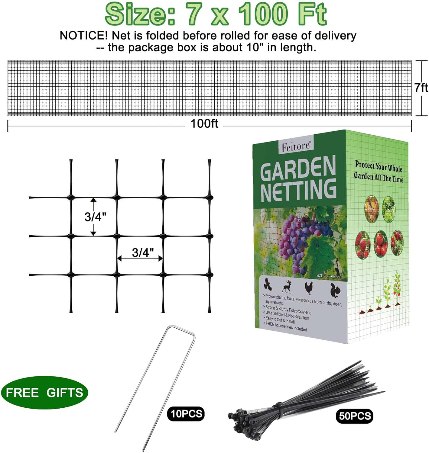 - Size: Deer netting size 7 feet x 100 feet; garden netting mesh size 3/4″; color: black; Easy to use accessories included: 10pcs installation nails & 50pcs cable ties