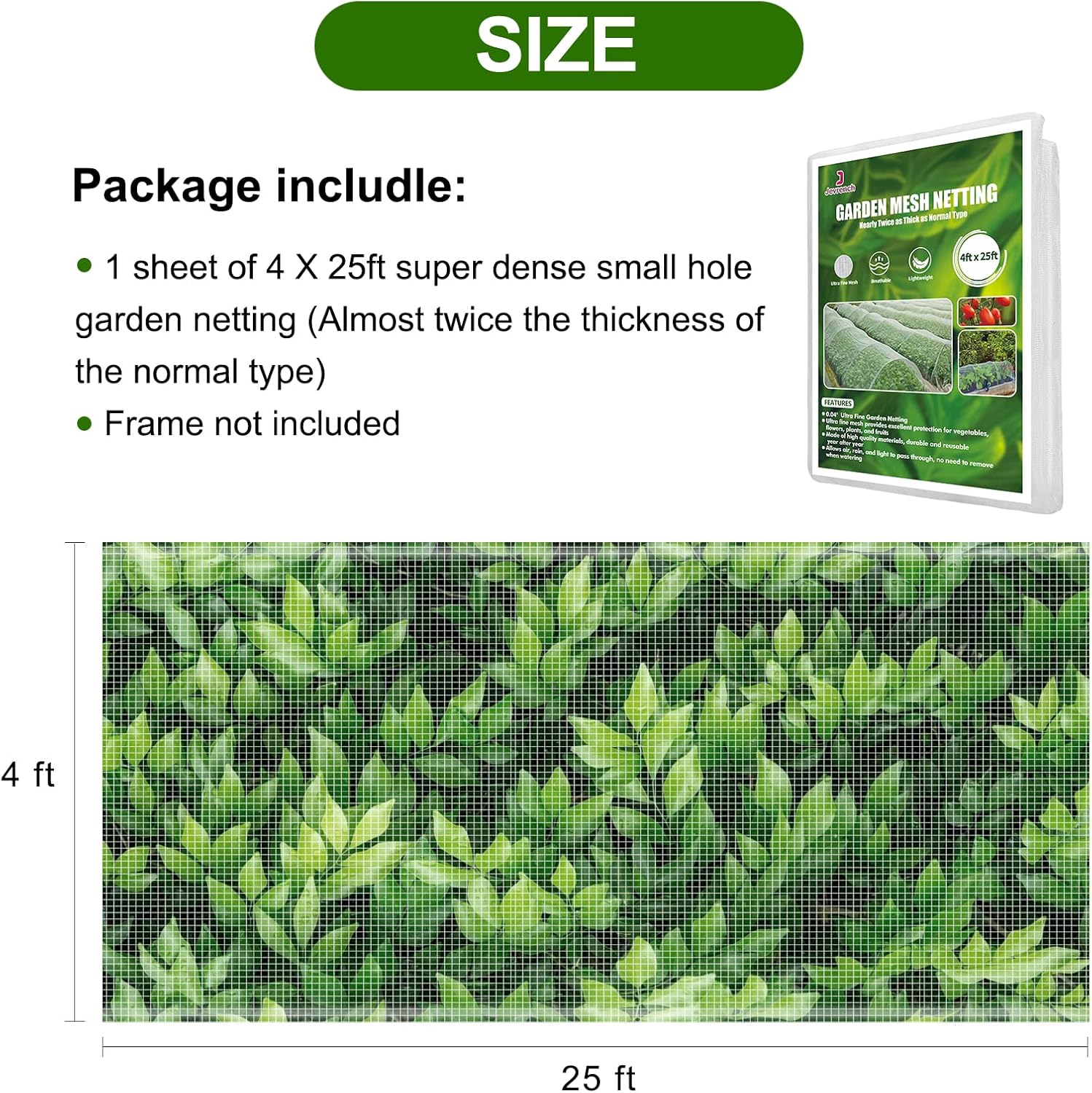 - Effective Physical Barrier: The large size of 4 x 25ft provides more security. Ultra fine garden netting with 0.8 mm x 1 mm ultra fine mesh, garden netting covers are widely used in pastures, orchards, and gardens, protect your vegetable investment with this simple shelter, The plant netting can not only perfectly protect vegetation, but also improve agricultural yields