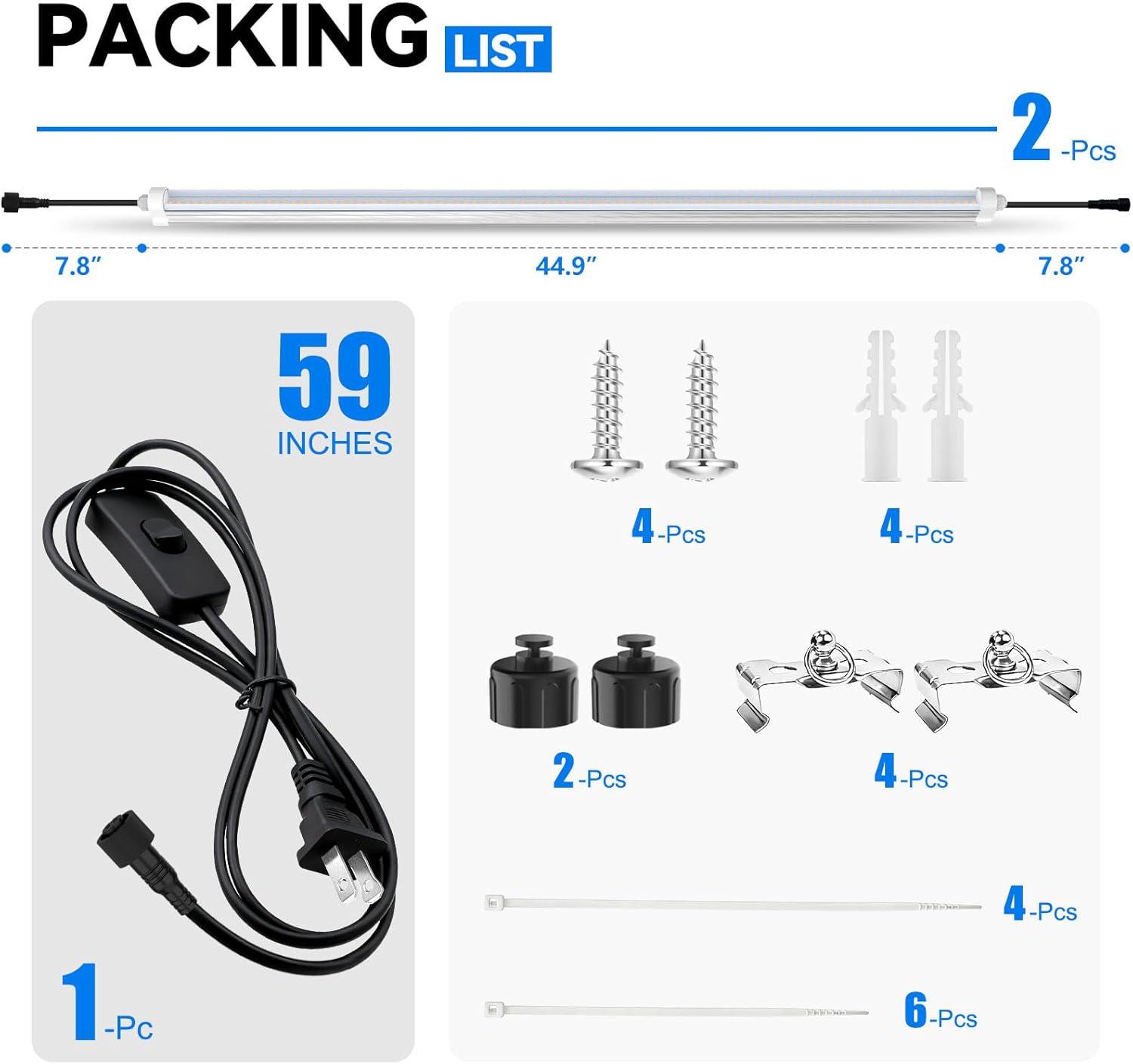 - 【What You Get】- Waterproof Grow Light x2, Power Switch Cord x1, Dust Cap x2, Bracket with Ring x4, Long Zip Ties x4, Short Zip Ties x6, Plastic anchor x4, Screw x4