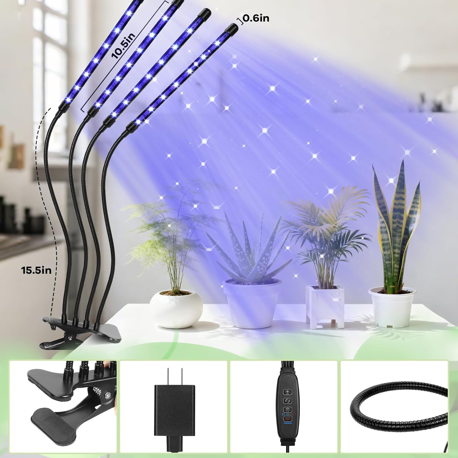 - 【 Flexible Gooseneck & Sturdy clip 】 : Plant light with 360° Goosenecks and strong clamp requires less space, and you can clip it to a shelf or table, adjusted to any Angle and distance. You can move it anywhere (bedroom, basement, office, vacation home, etc.) and your plants can enjoy sunlight everywhere by growing light.