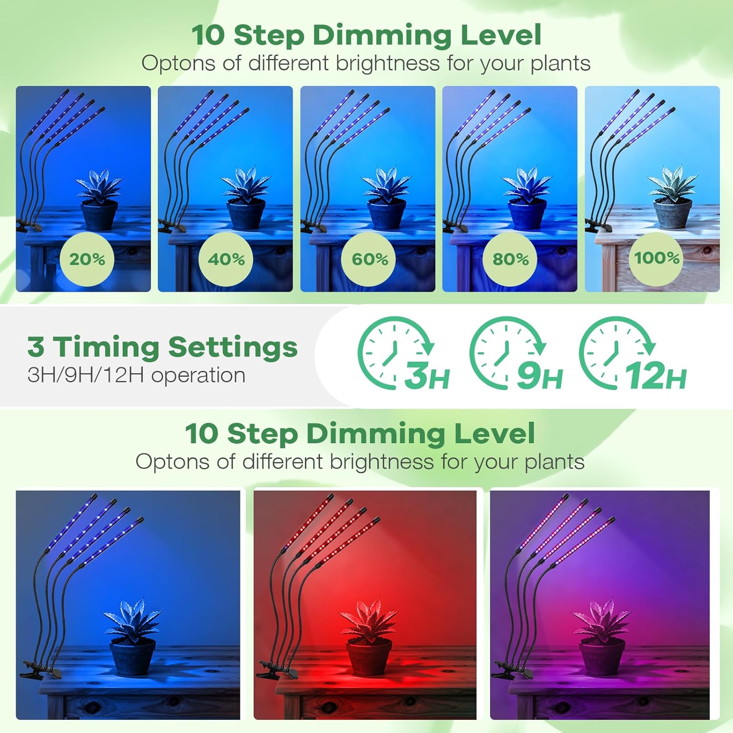 - 【Timing Function】 : Led grow lights have cyclic memory timing function, the product will automatically open and close, you can set 3 hours, 9 hours, 12 hours, do not need manual operation, can take better care of the plant.