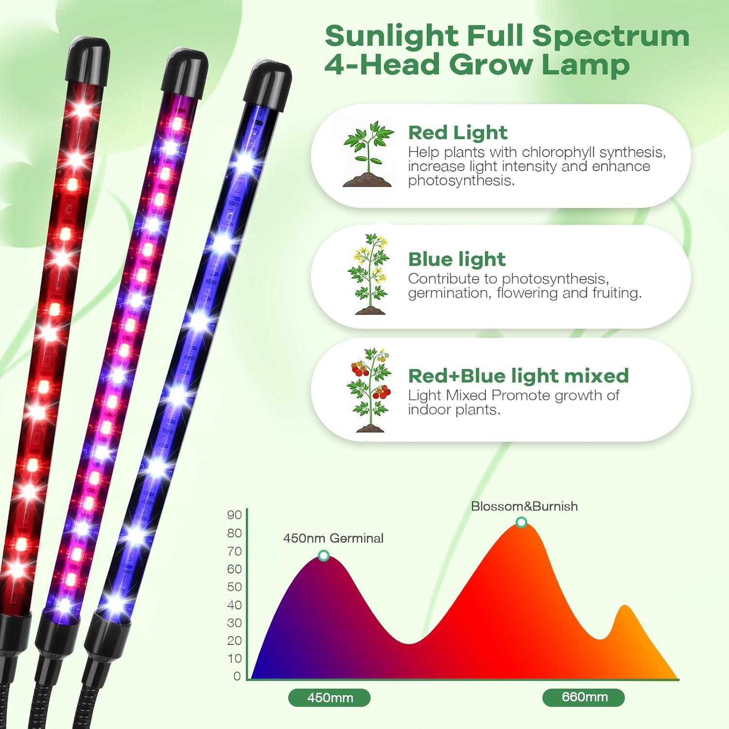 - 【Red, Blue Grow Light】 : The grow light for indoor plants is composed of red blue two different led beads, it meets the condition of plant growth without sunlight. Red (660nm)+ blue (460nm) spectrum: For flowering and fruit. Red + Blue : A mix of red + blue is the best fuel for your plant growth.