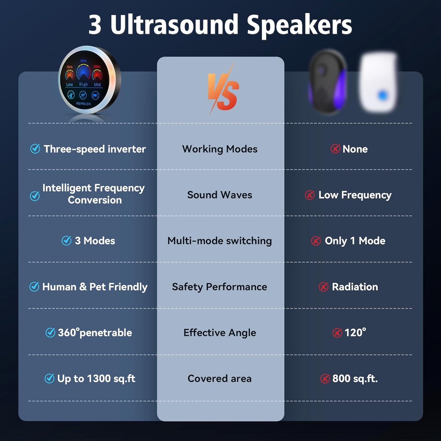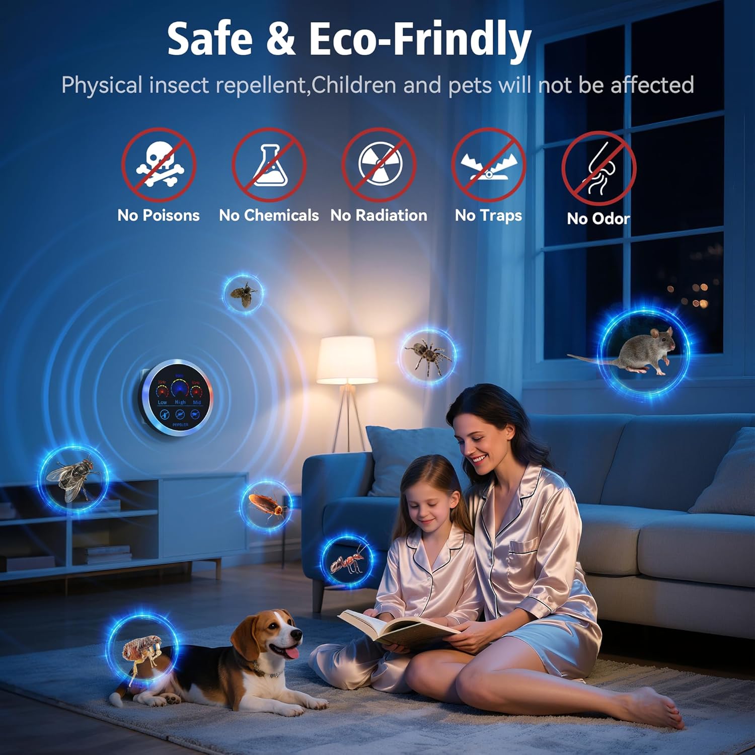 - Ultrasonic Technology: The plug in Pest repellent indoor ultrasonic irritates pests’ brains and auditory nervous systems to effectively repel a wide range of mouse, rodents, mosquitoes, flies, beetles, cockroaches, moths, ants, bedbugs, rodents, fleas, ants, spiders, bugs and insects, etc