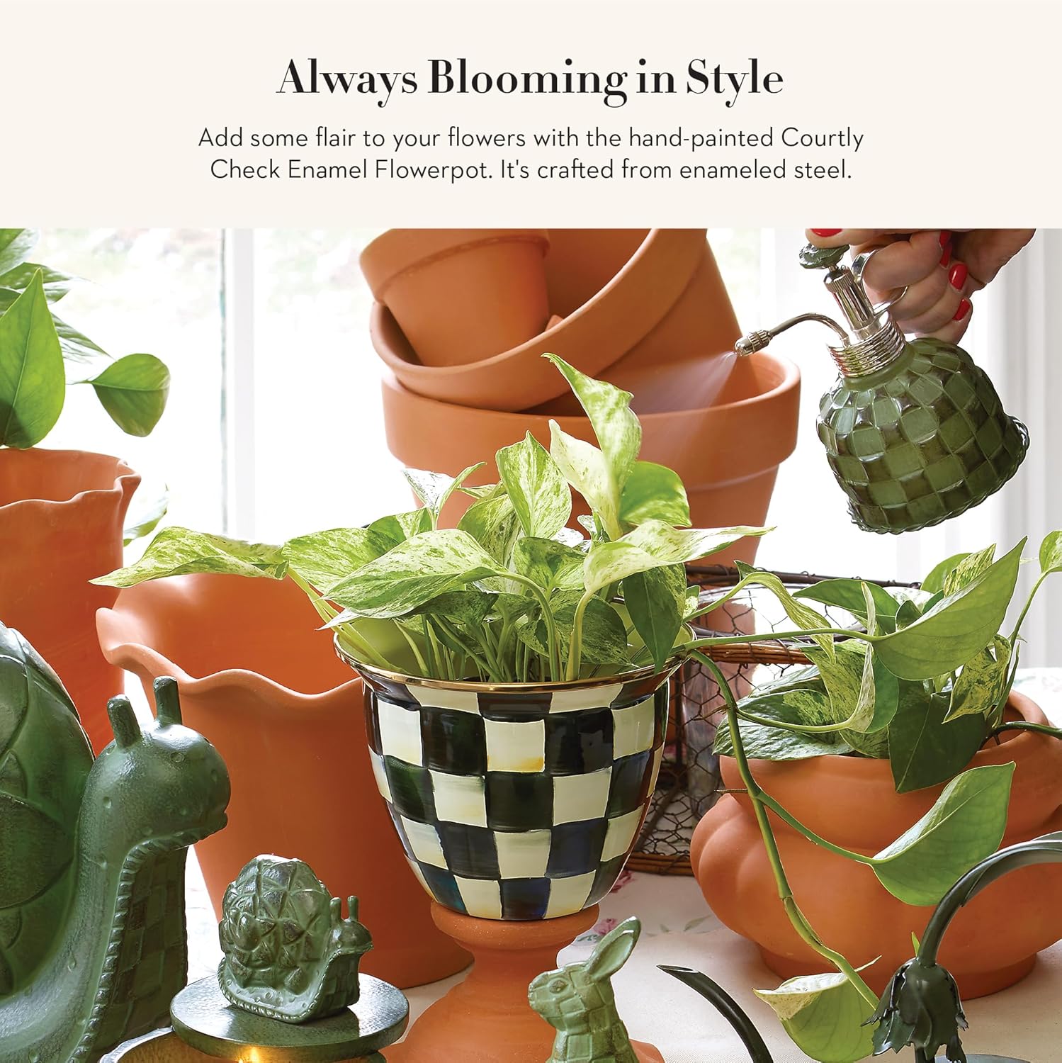 - ELEGANT PLANTER POT: This pot for indoor plants is rimmed in bronzed stainless steel and features our hand-painted black-and-white Courtly Check pattern. It matches any decorative theme to dress up your living room, kitchen, entryway, and more.