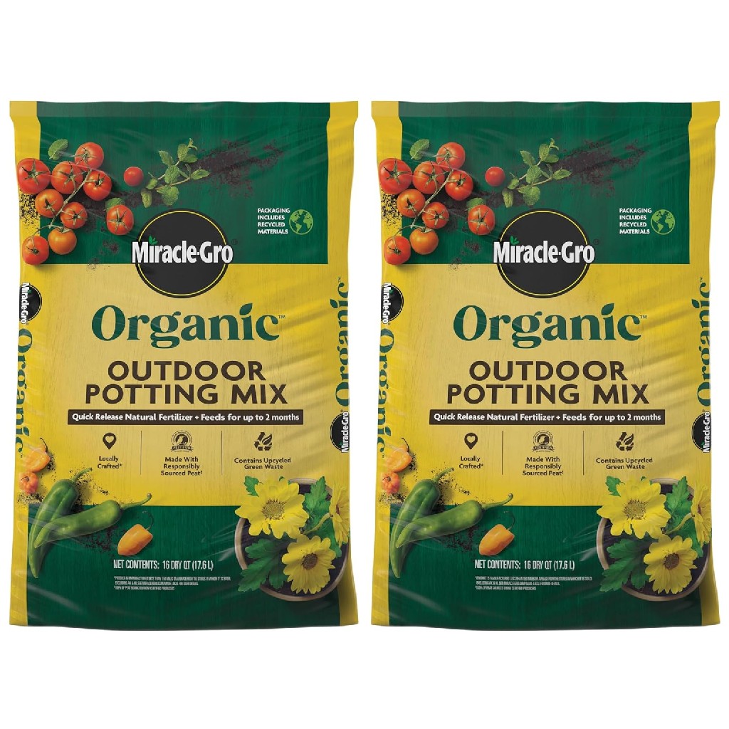 - This bundle includes two 16 qt. bags of Miracle-Gro Organic Outdoor Potting Mix; each fills one 12-inch container (amounts may vary based on the size of the root ball)