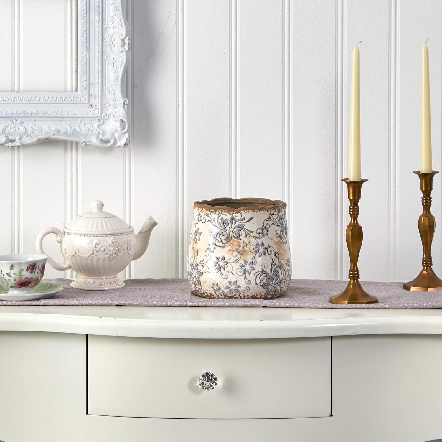 - HOME DÉCOR ACCENT: Looks like you just walked into a rustic, antique store with this floral design vase. Artisanal in design, bring cozy, homey vibes with the floral pattern against a rugged square-like silhouette. 7” in width, pair with your favorite fake flowers for a faux-bulous arrangement. No drainage hole and for indoor use only.
