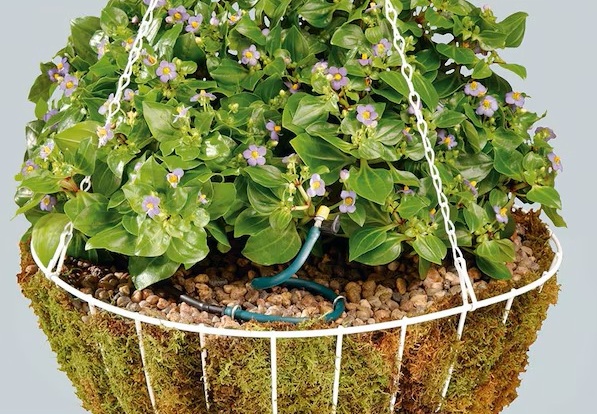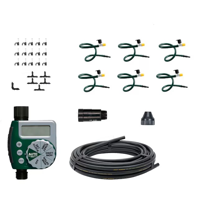 The hanging basket drip watering kit is engineered specifically for watering one large hanging basket or two smaller hanging baskets. The misting micro-sprinklers with flow control provide optimum flow so that the potting soil can easily absorb the watering without puddling. You can easily store it during the winter. The 56318 Hanging Basket Drip Watering Kit includes a 1-Outlet Digital Hose Faucet Timer. The digital timer offers oversized features for ease of use, a manual rain delay option which conserves water, and programmable runtime and interval scheduling flexibility, with heavy-duty, weatherproof construction. Attach the digital timer to your outside faucet and enjoy a fully automatic drip watering system. Compatible with drip fittings from Orbit, Hydro-Rain, and other major brands, which makes the kit easily expandable. For outdoor irrigation use with cold water only.
