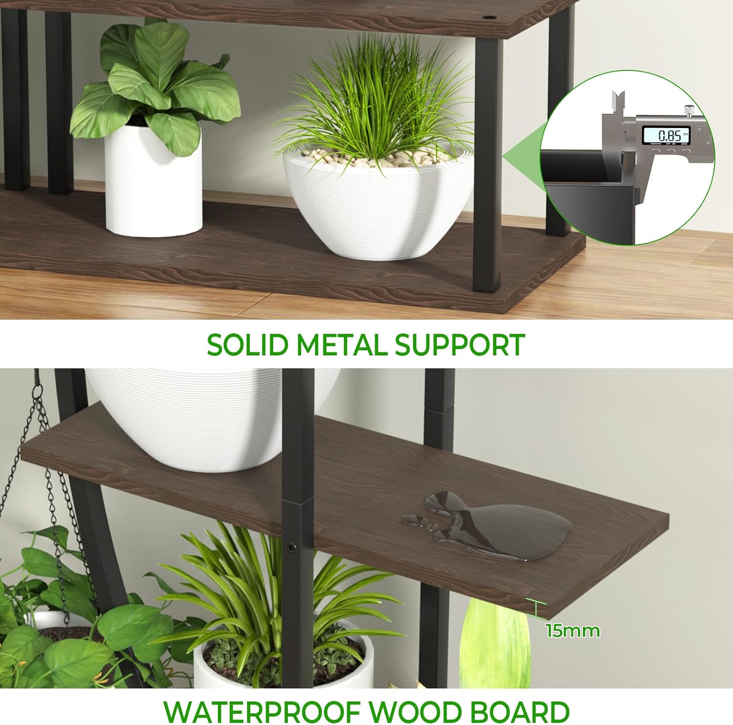 - ๐ชต ๐ฆ๐๐๐ฟ๐ฑ๐ & ๐ช๐ฎ๐๐ฒ๐ฟ๐ฝ๐ฟ๐ผ๐ผ๐ณ ๐ ๐ฎ๐๐ฒ๐ฟ๐ถ๐ฎ๐น – ๐๐ผ๐น๐ฑ ๐๐ฎ๐ฟ๐ด๐ฒ ๐ฃ๐น๐ฎ๐ป๐๐ ๐ฆ๐๐ฎ๐ฏ๐น๐: Our indoor plant rackโs structure is crafted from 0.85 mm thick heavy-duty iron pipes, featuring special anti-rust coating for more durability. Each wooden board is wrapped in a waterproof layer, 15 mm thick board can hold any heavy plants with ease.