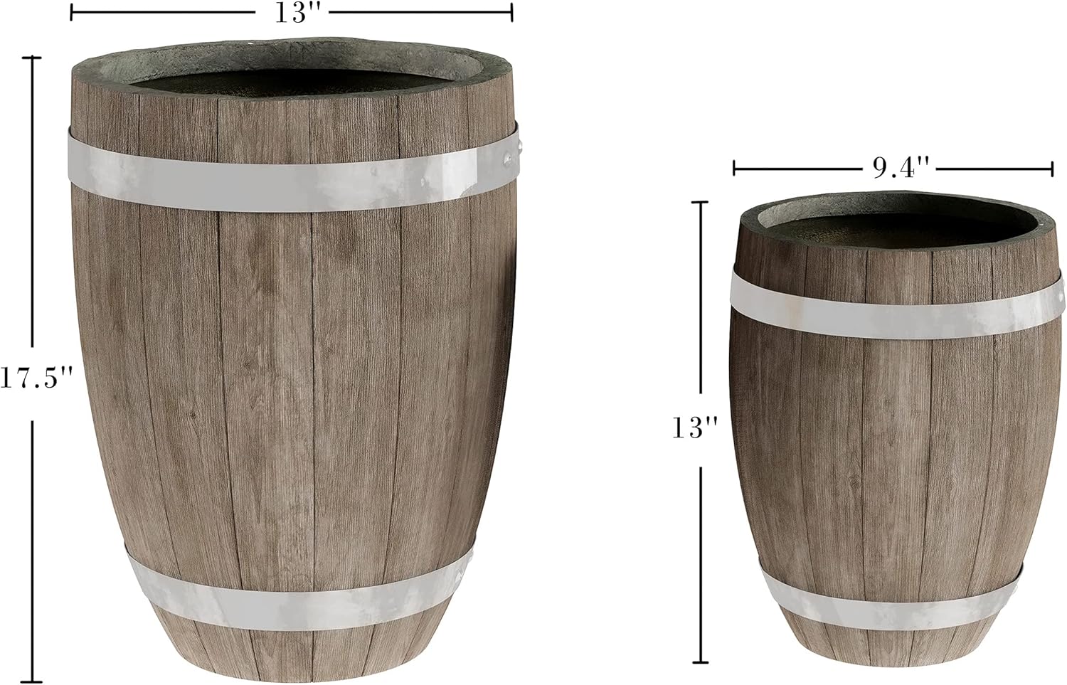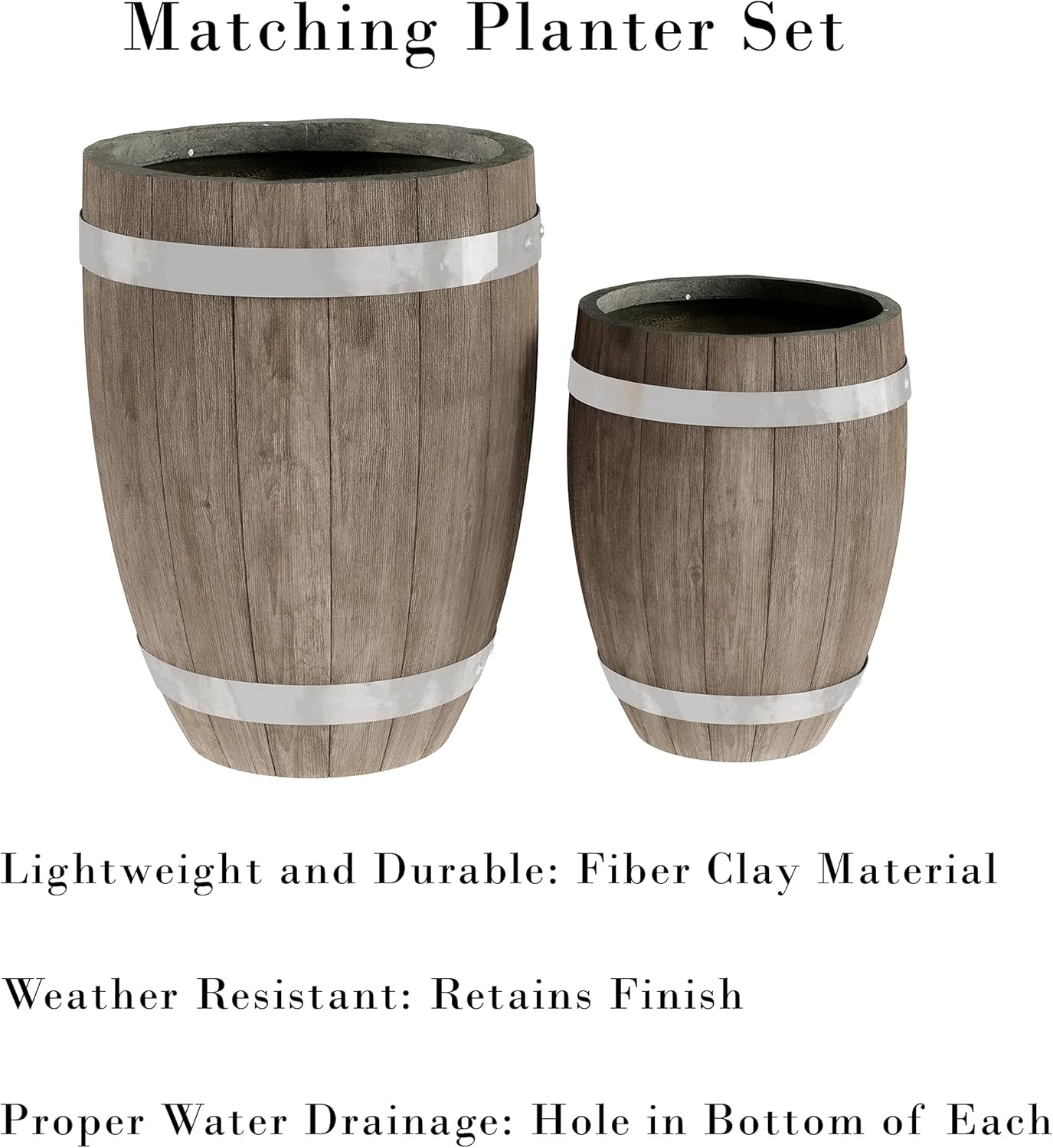 • LIGHTWEIGHT MATERIALS – These unique barrel planters are made of a fiberglass and clay blend that is designed to withstand any climate or weather conditions season after season. The garden pots are a lightweight alternative to using concrete planters.