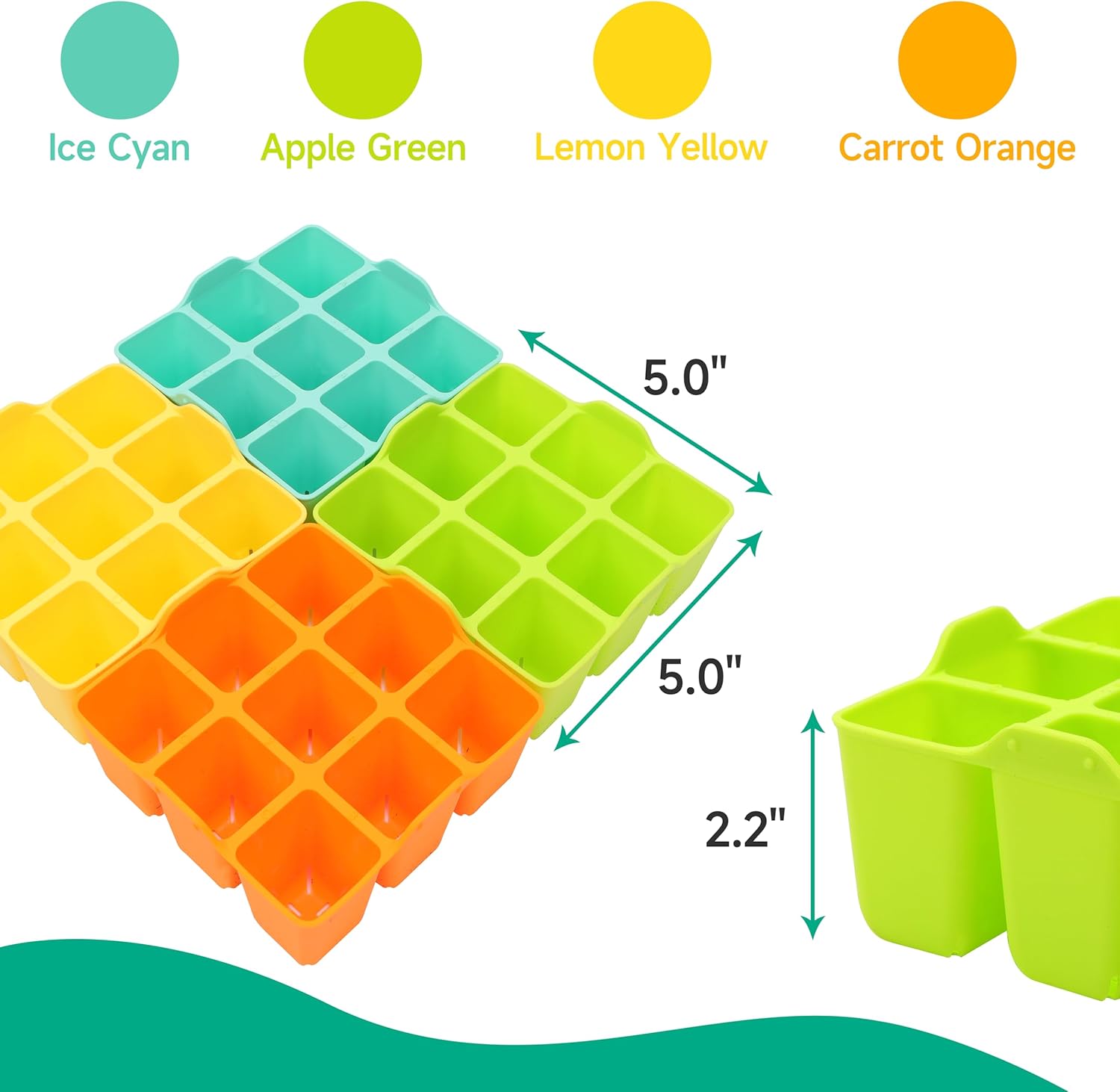 - What You Get: You will receive 8 packs of silicone seed trays in 4 vibrant colors (Ice Cyan×2, Apple Green×2, Carrot Orange×2, and Lemon Yellow×2). Tray dimensions: 5.0″L x 5.0″W x 2.2″H; individual cell: 1.6″L x 1.6″W. Perfect for seed starting!