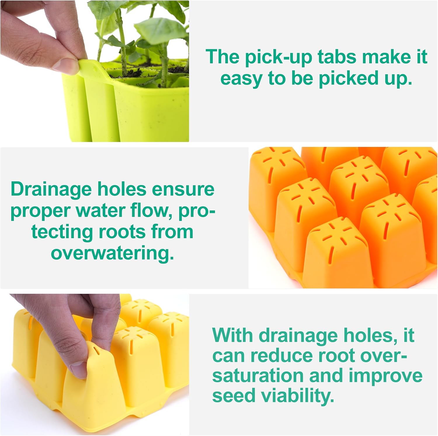- High-Quality: Crafted from thick, durable silicone that never melts under direct sun and never cracks under freezing temperatures. Plus, they are dishwasher safe, making cleaning a breeze. Ensure the best care for your seedlings by our premium trays!