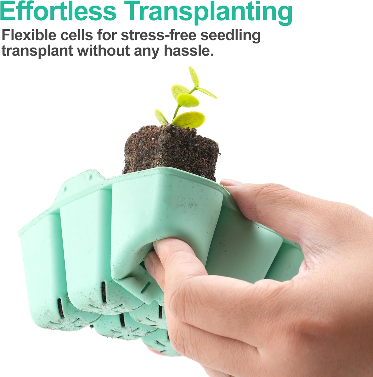 - Simplified Transplanting: Soft, food-grade silicone cells cradle seedlings and flex gently to pop out during transplantation. This thoughtfully designed system minimizes stress and safeguards delicate roots, protecting the health of your seedlings.