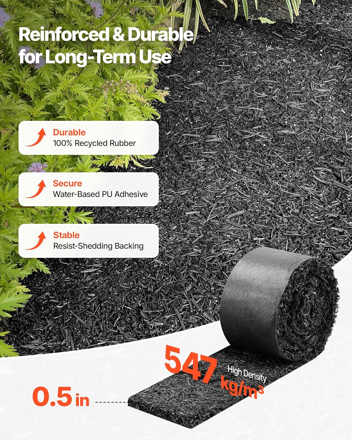 - Effectively Blocks Weeds: Our recycled rubber mulch roll features interwoven rubber fibers that combined with a dense weed-blocking backing create a double barrier that blocks sunlight and suppresses weed growth. Enjoy a clean, well-maintained garden